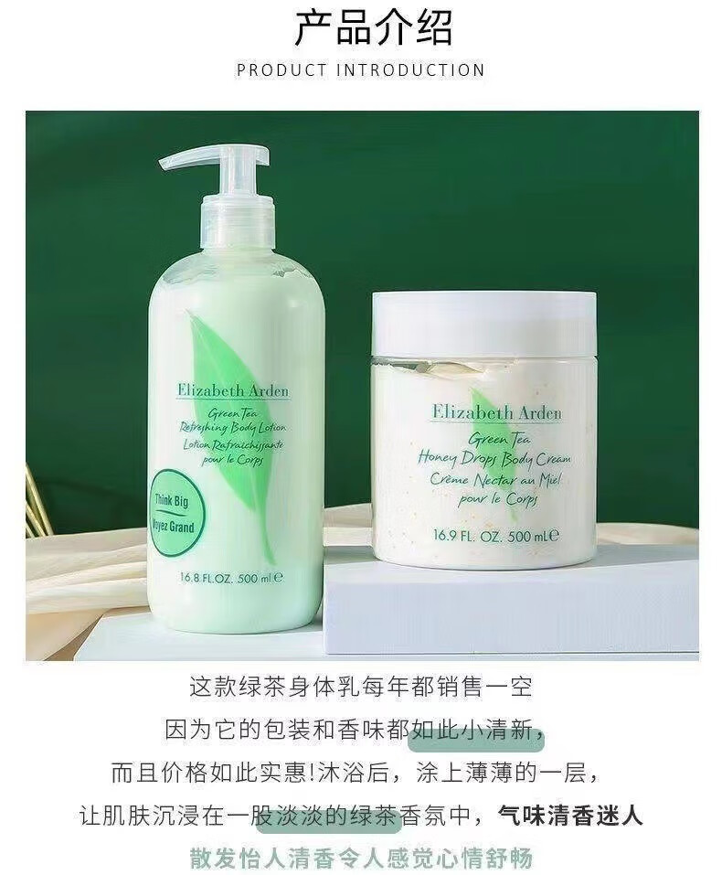 商品名称:伊丽莎白雅顿(Elizabeth Arden)原装进口 绿茶身体乳 白茶野玫瑰橙花滋润保湿润肤乳液清爽不油腻 绿茶蜜滴身体乳500ml【罐装】